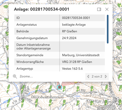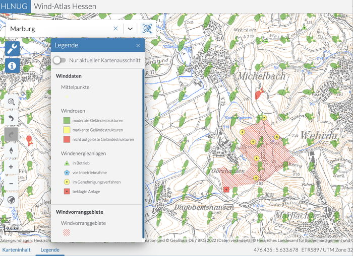 Das Hessische Landesamt für Naturschutz, Umwelt und Geologie stellt den Wind-Atlas Hessen zur Verfügung. Mit diesem Fachinformationssystem können Sie sich über Windenergieanlagen, Planungsgebiete und Naturschutzräume in Hessen informieren.